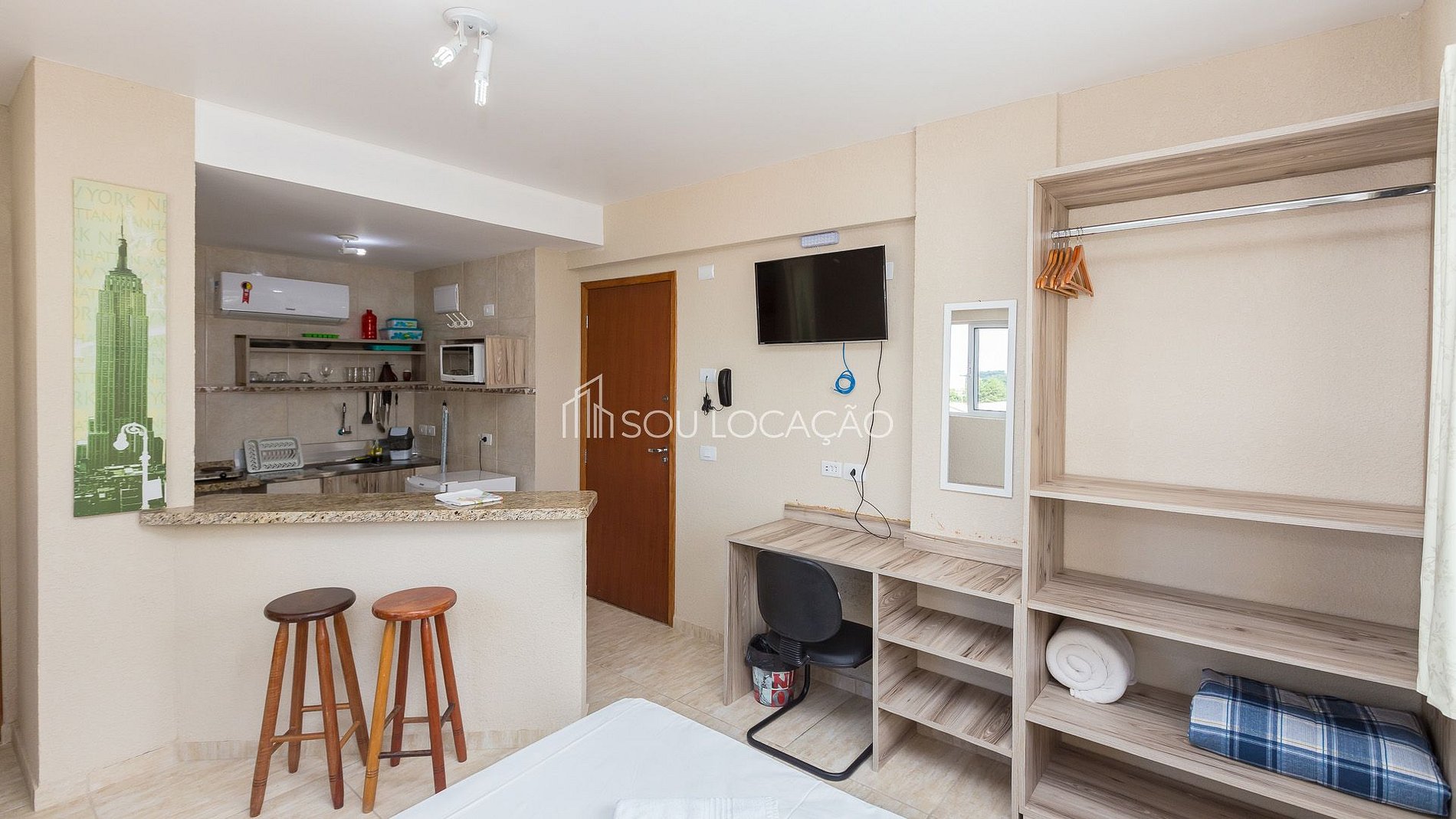 Nossos Estúdios são 100% residenciais, confortáveis com ar condicionado (quente e frio), TV Smart, internet de (fibra óptica), devidamente equipados/mobiliados com, armários, roupa de cama com edredons/manta, travesseiros, cama box casal (podendo transformá-la em duas de solteiro), enxoval de banho com, toalhas de rosto, banho e pé, e banheiro com box.