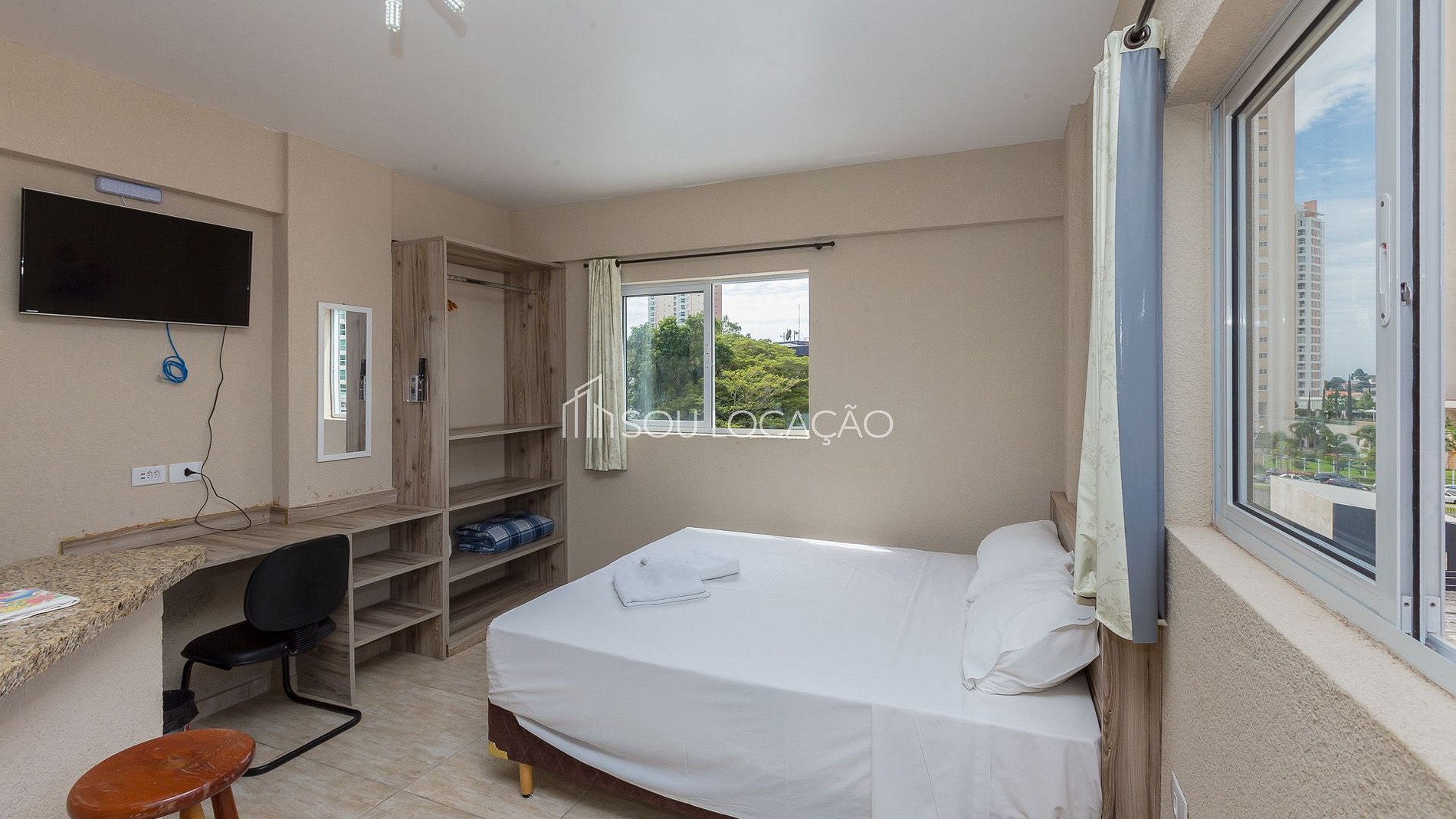 Nossos Estúdios são 100% residenciais, confortáveis com ar condicionado (quente e frio), TV Smart, internet de (fibra óptica), devidamente equipados/mobiliados com, armários, roupa de cama com edredons/manta, travesseiros, cama box casal (podendo transformá-la em duas de solteiro), enxoval de banho com, toalhas de rosto, banho e pé, e banheiro com box.