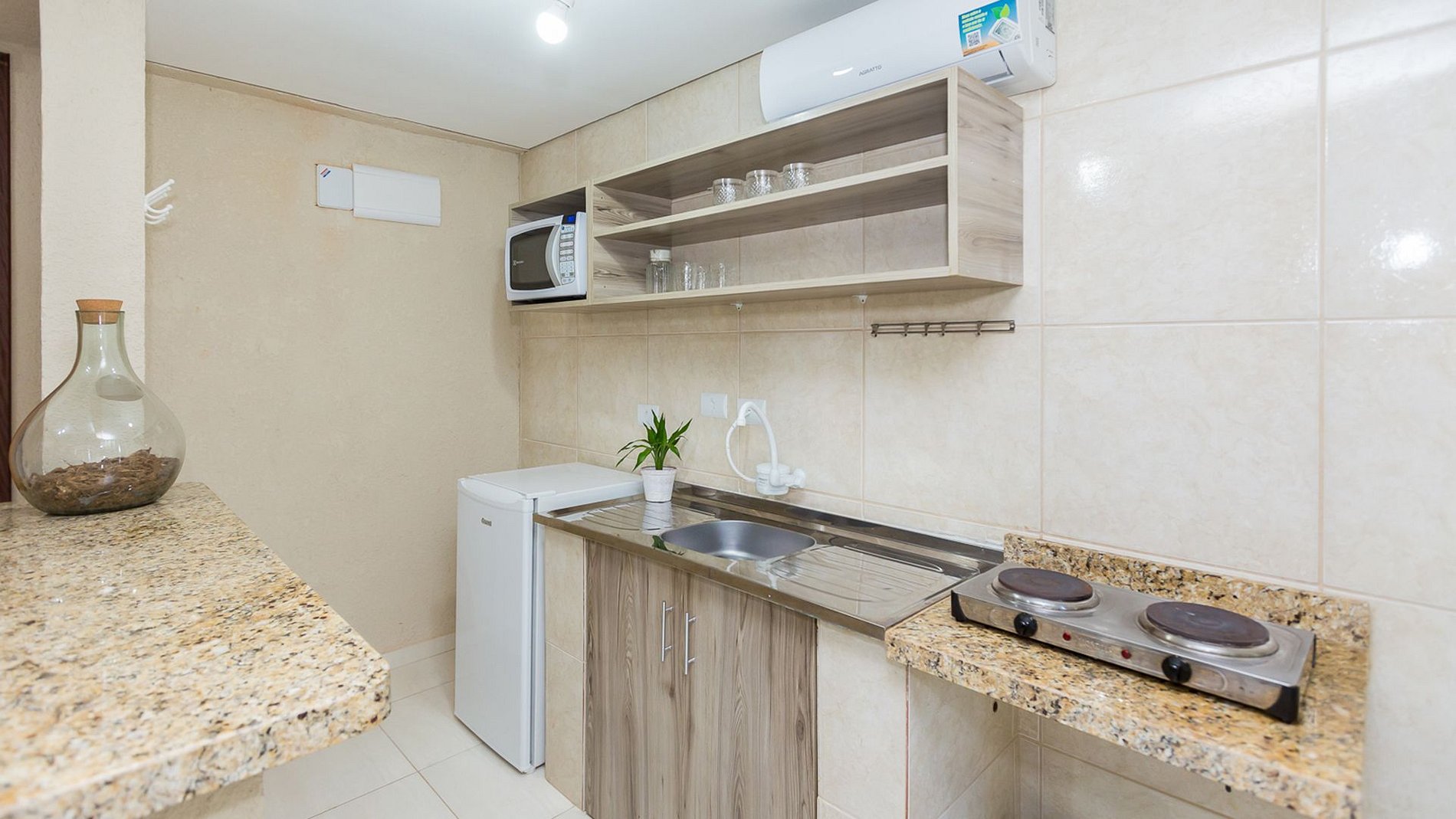 Cozinha totalmente equipada, com eletrodomésticos, frigobar, micro-ondas, talheres/itens em geral, bancada com cadeiras, e ainda temos um tanque estratégico para uso de emergência, etc.