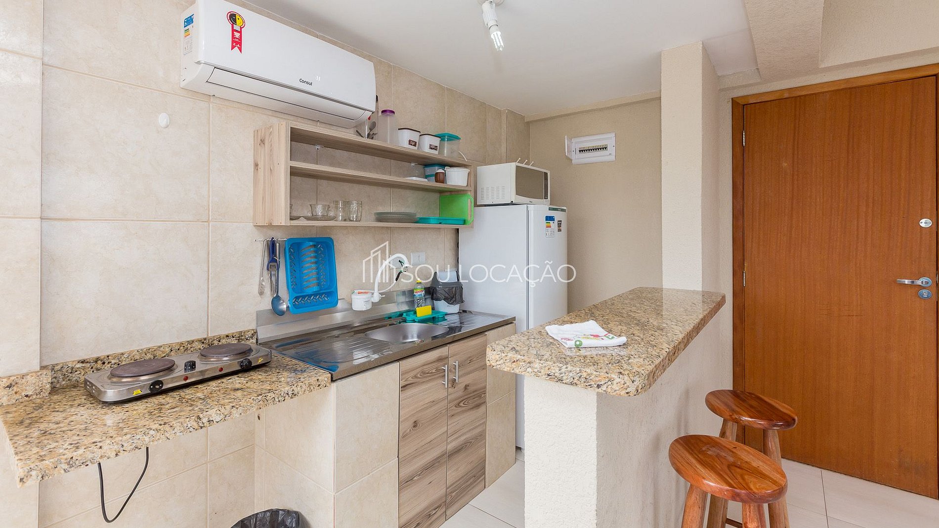 Cozinha totalmente equipada, com eletrodomésticos, frigobar, micro-ondas, talheres/itens em geral, bancada com cadeiras, e ainda temos um tanque estratégico para uso de emergência, etc.