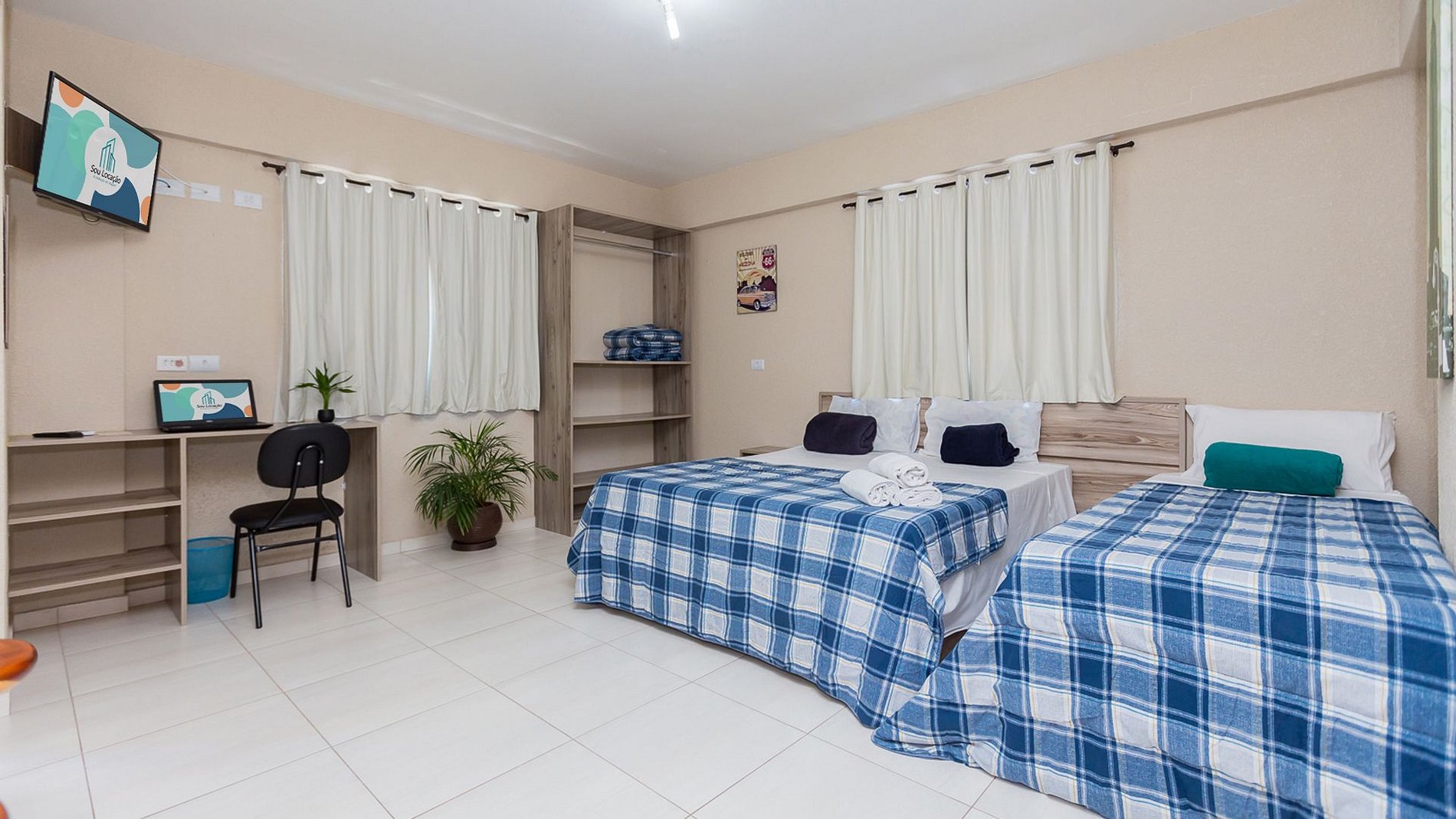 Nossos Estúdios são 100% residenciais, confortáveis com ar condicionado (quente e frio), TV Smart, internet de (fibra óptica), devidamente equipados/mobiliados com, armários, roupa de cama com edredons/manta, travesseiros, cama box casal (podendo transformá-la em duas de solteiro), enxoval de banho com, toalhas de rosto, banho e pé, e banheiro com box.