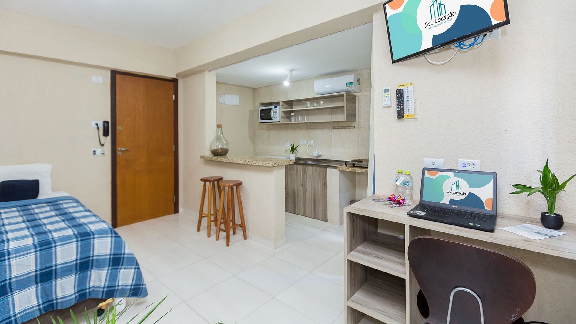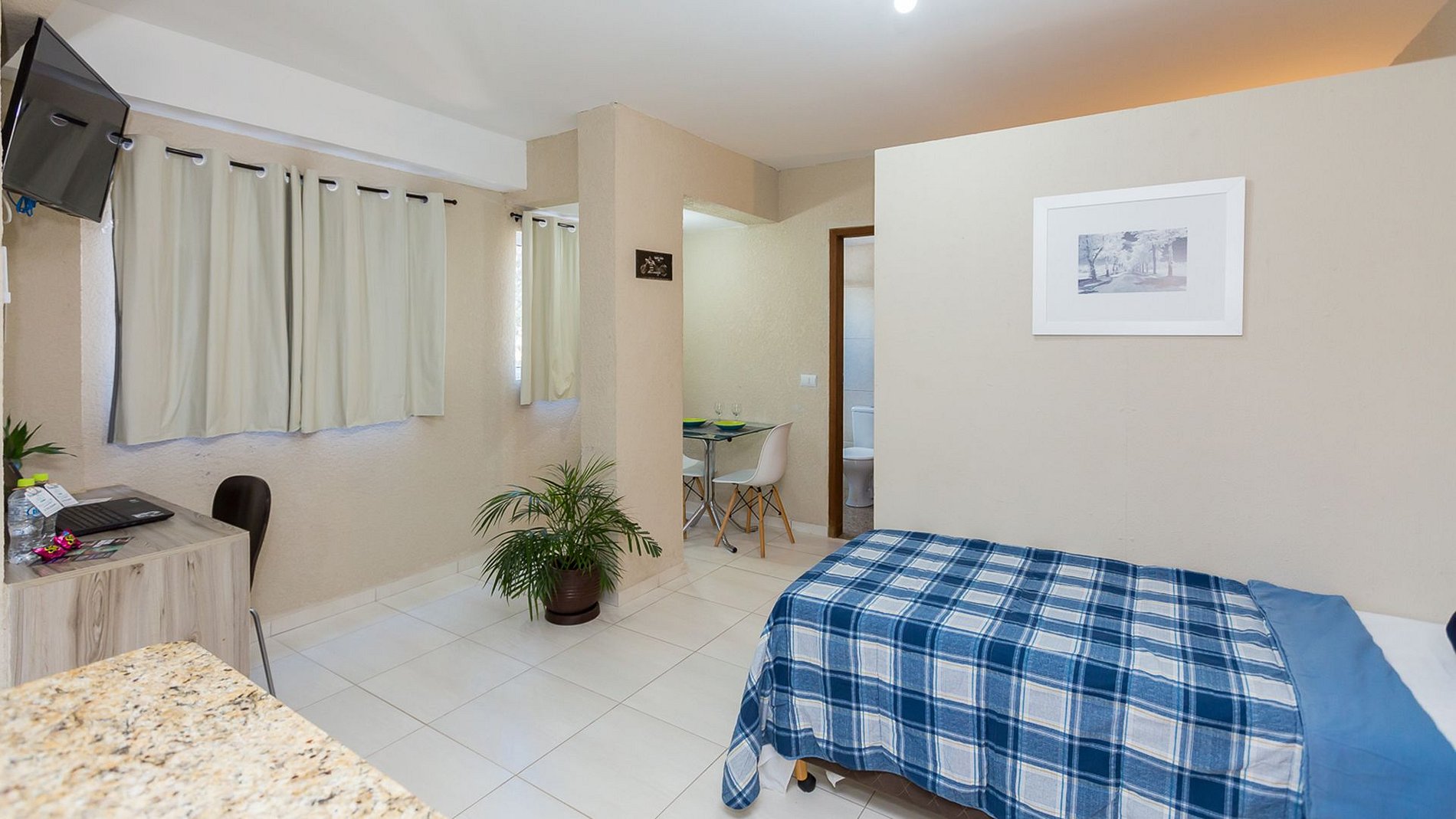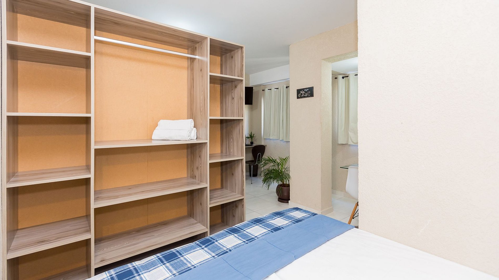 Nossos Estúdios são 100% residenciais, confortáveis com ar condicionado (quente e frio), TV Smart, internet de (fibra óptica), devidamente equipados/mobiliados com, armários, roupa de cama com edredons/manta, travesseiros, cama box casal (podendo transformá-la em duas de solteiro), enxoval de banho com, toalhas de rosto, banho e pé, e banheiro com box.
