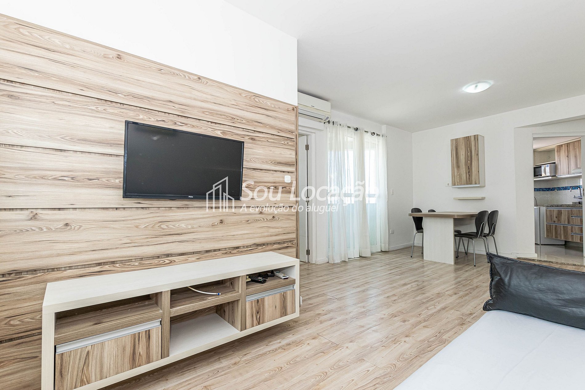 Ambiente integrado com sacada, mesa com quatro cadeiras, sofá-cama, TV a cabo e estação de trabalho com escrivaninha, ideal para quem precisa estudar ou trabalhar durante a estadia.