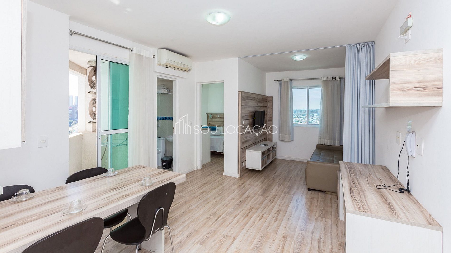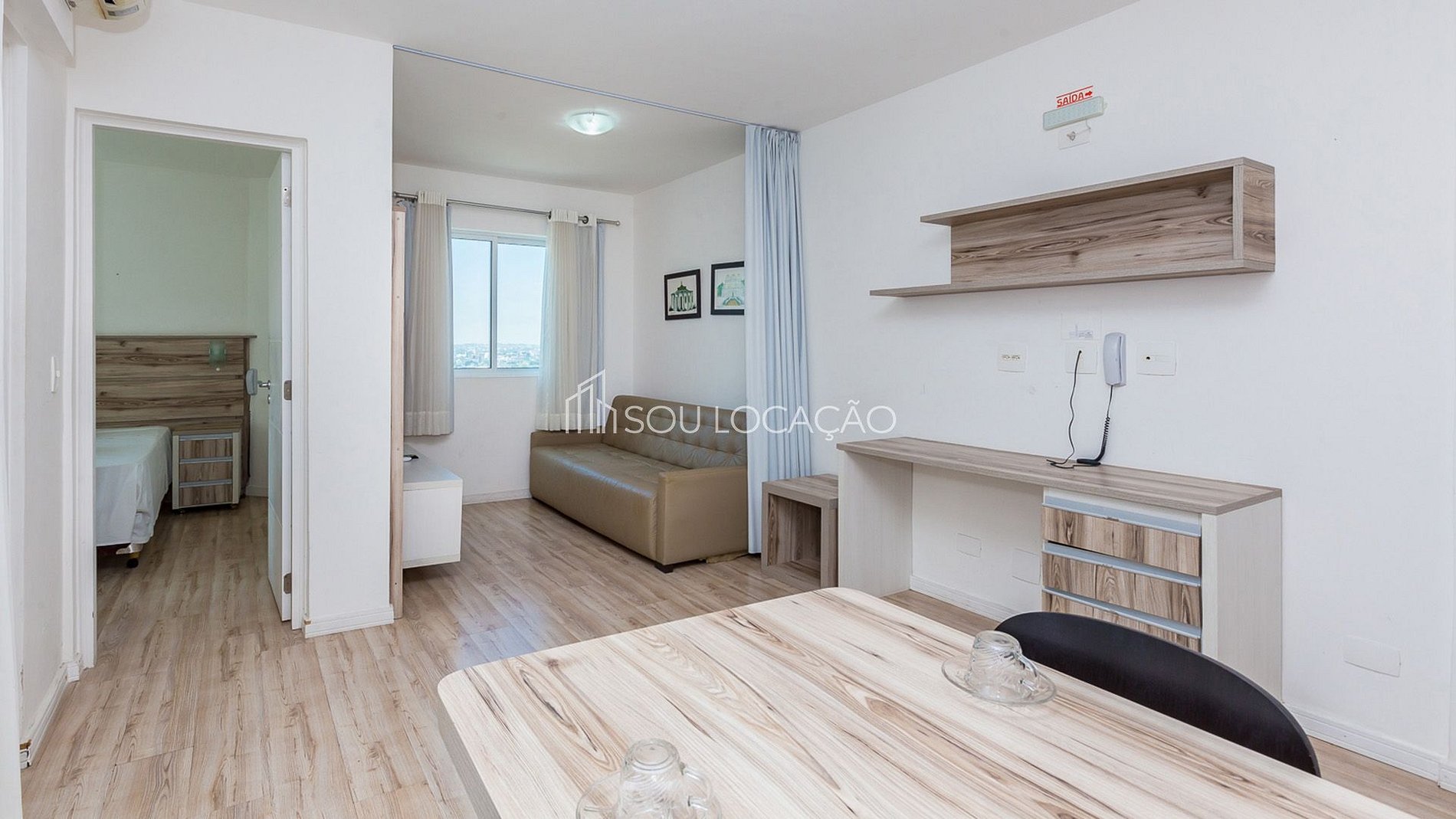 ÁREA CONJUGADA DE: Copa/Sala com sacada, mesa com quatro cadeiras, sofá-cama, TV a cabo, mesa de trabalho/escrivaninha.