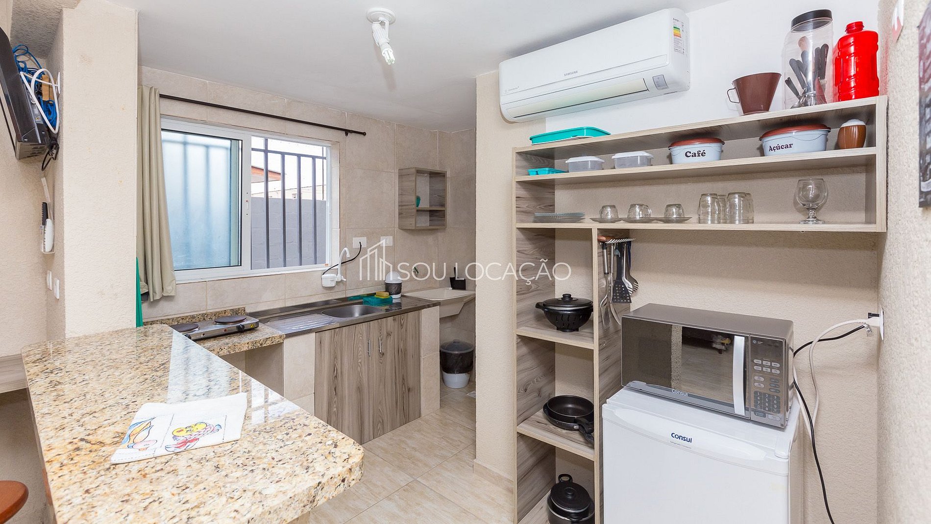 Cozinha totalmente equipada, com eletrodomésticos, frigobar, micro-ondas, talheres/itens em geral, bancada com cadeiras, e ainda temos um tanque estratégico para uso de emergência, etc.