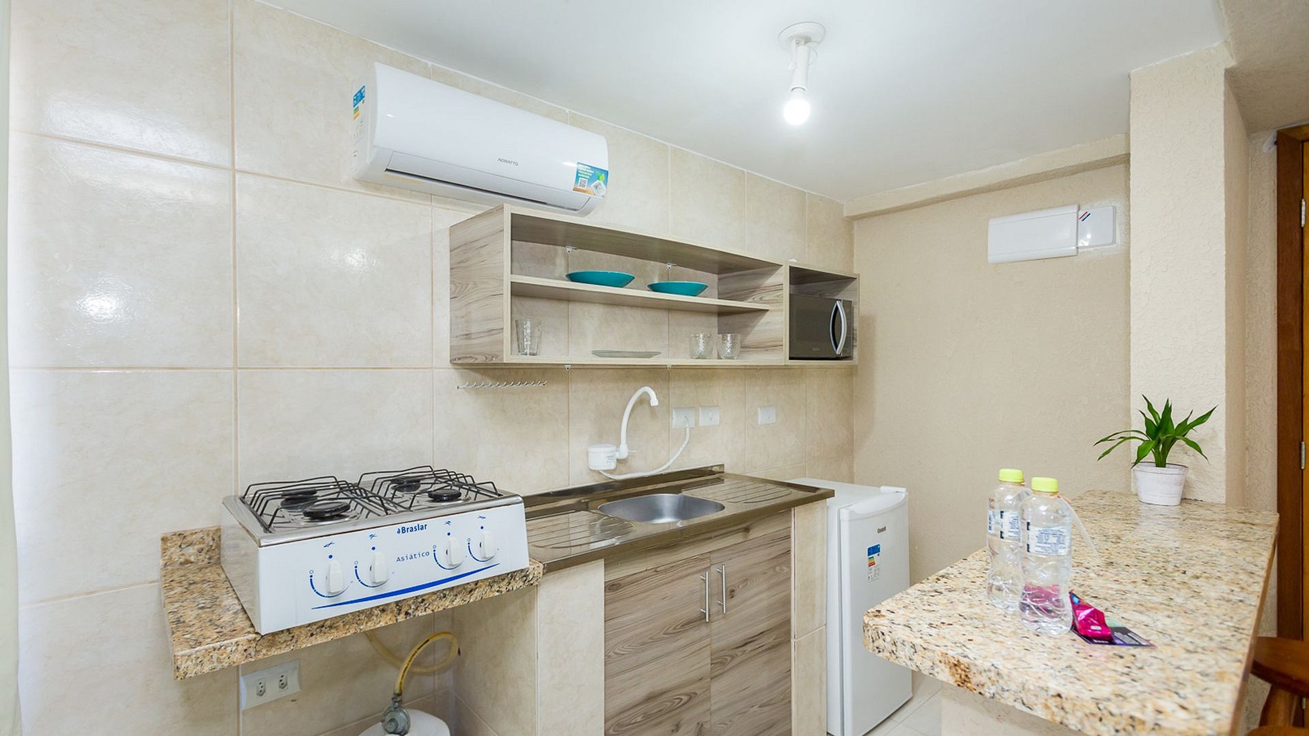 Cozinha totalmente equipada, com eletrodomésticos, frigobar, micro-ondas, talheres/itens em geral, bancada com cadeiras, e ainda temos um tanque estratégico para uso de emergência, etc.
